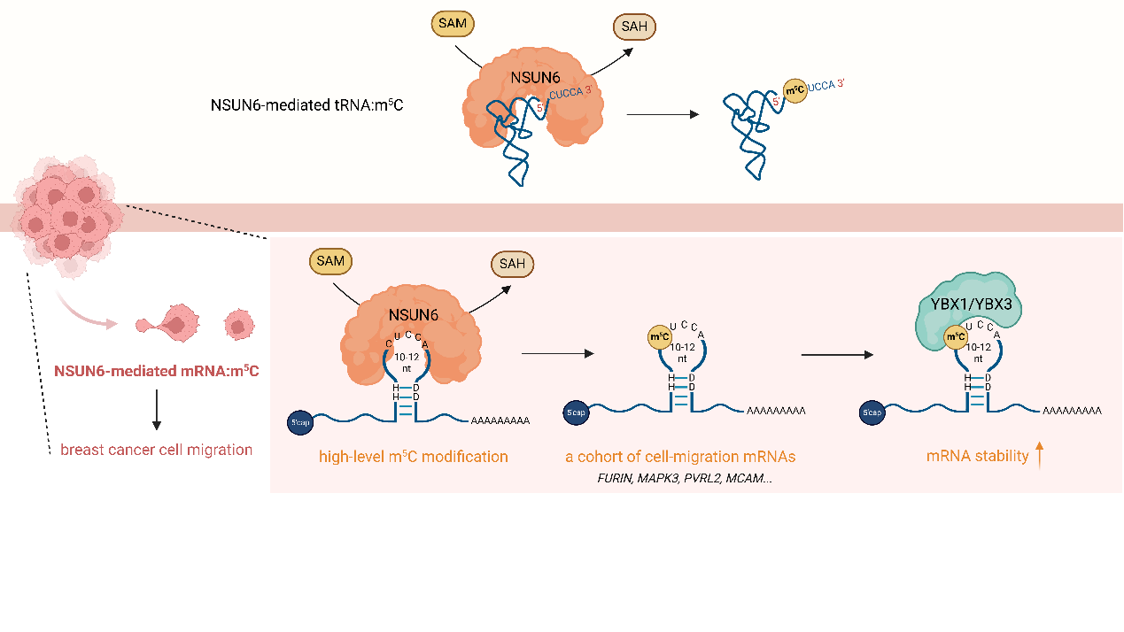 图1. NSUN6通过mRNA:m5C催化活性促进乳腺癌细胞迁移的机制示意图
