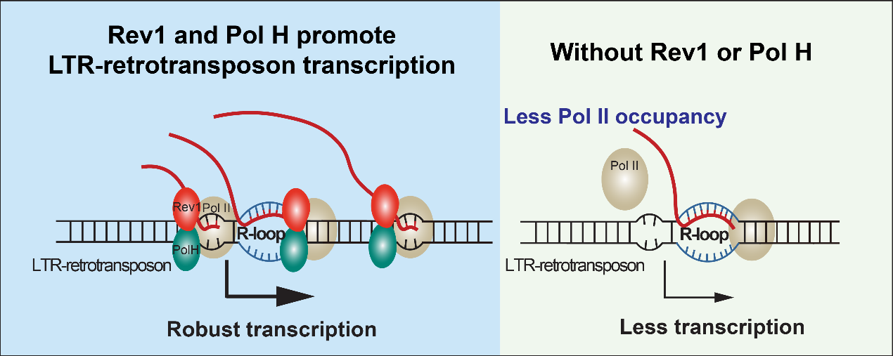 研究人员综合使用分子、生化、生信分析等多种研究手段,证明在转座子激活的果蝇卵巢中,Rev1和PolH一方面结合LTR型逆转座子的转录起始区域,另一方面结合RNA聚合酶II,并保护Pol II在LTR型逆转座子富集R-loop的“转录困难”区域不易解离,从而促进LTR型逆转座子的转录。这项研究不仅鉴定了LTR型逆转座子新的宿主因子,还揭示了跨损伤修复DNA聚合酶在促进转座子转录方面的功能。